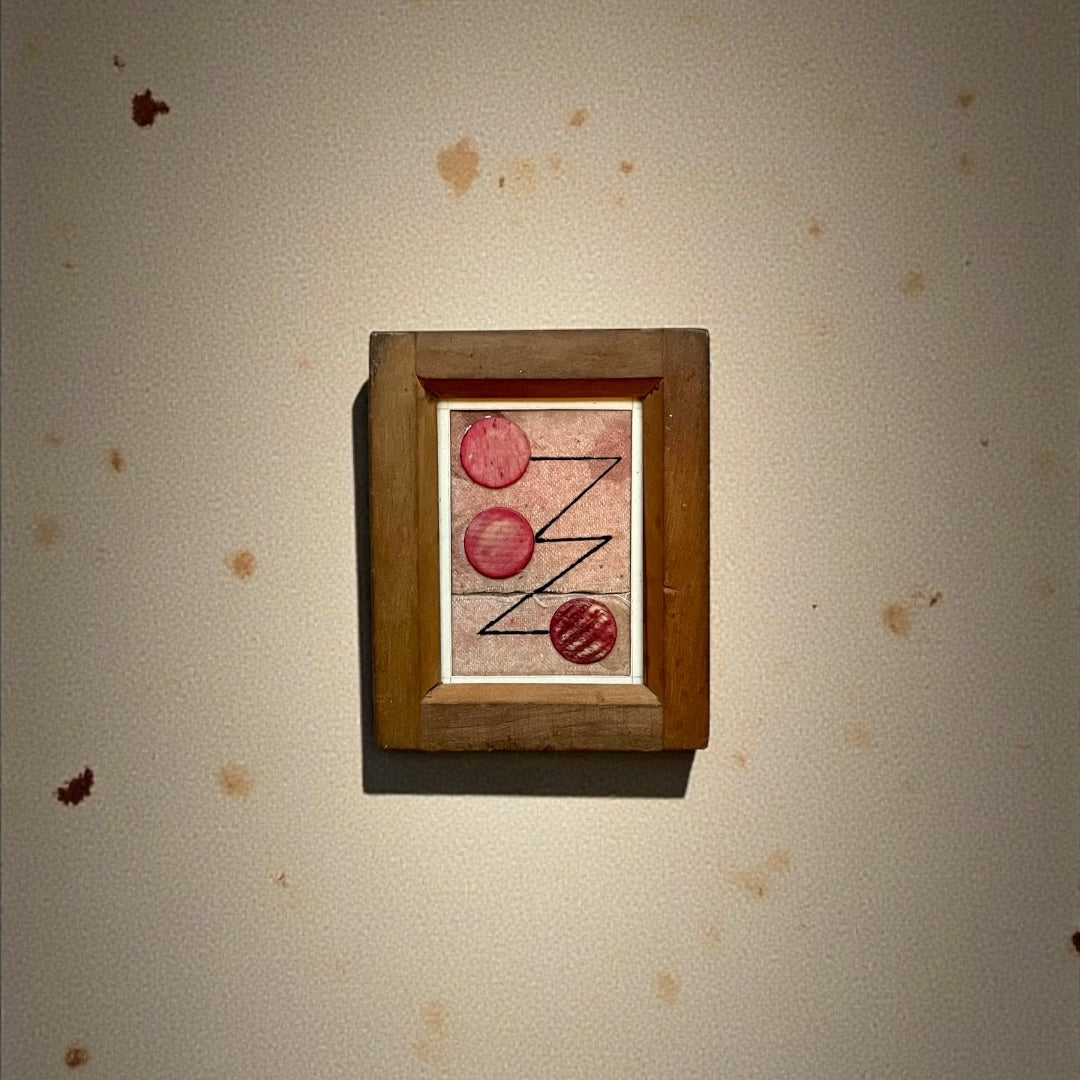 Diminutive in size, ink and antique gaming counters framed and glazed in an early 20th century contact printing frame.