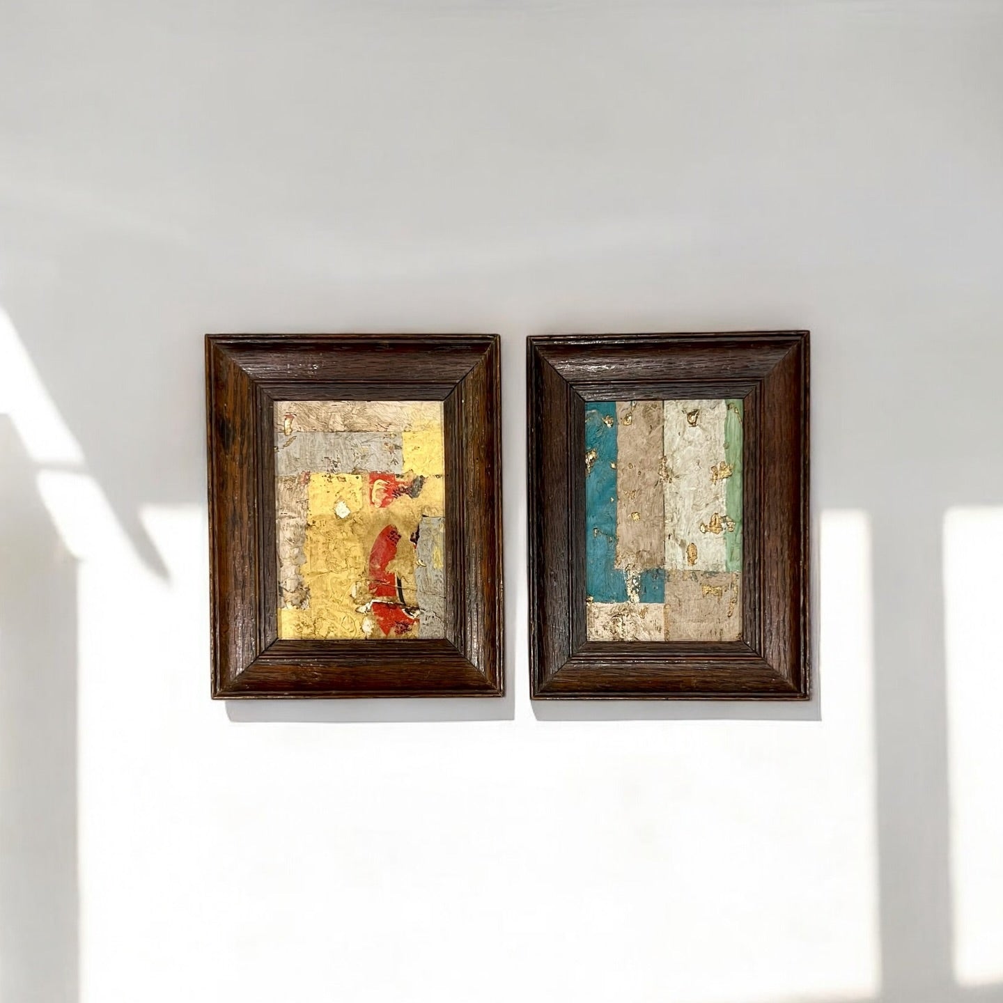 Household paint and gesso on 1950’s film poster laid on board. Framed in diminutive mid 20th century oak frames. 19.5cm x 15.5cm.